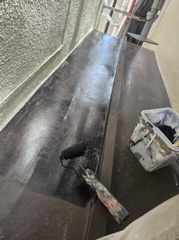 ↑シャッターボックス 1回目上塗り(トップコート)塗布作業中