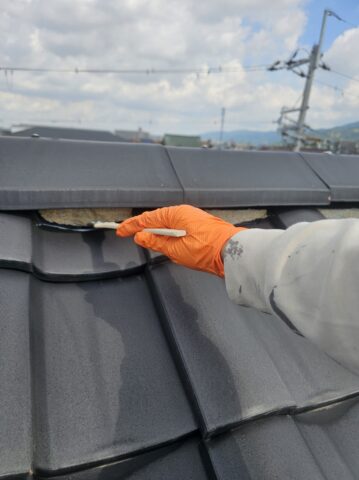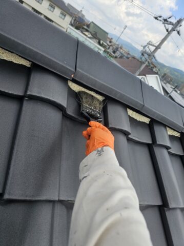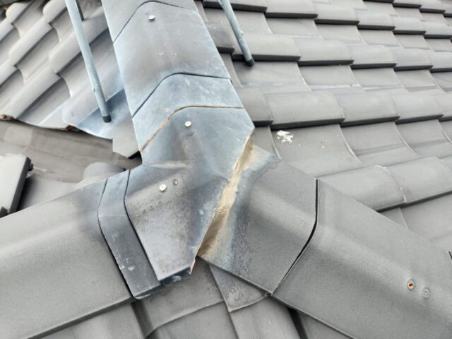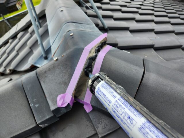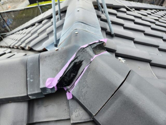↑屋根 棟瓦 シーリング補修中 元々補修を行っていたシーリングが劣化していたので、同じ箇所をシーリング補修を行いました👷🏻♀️