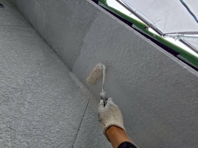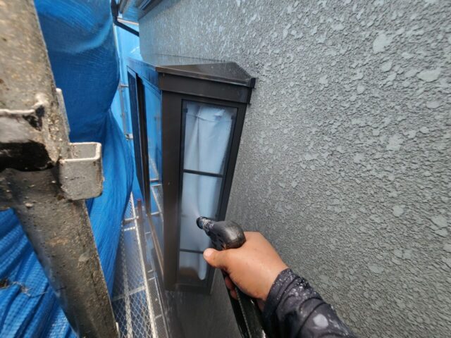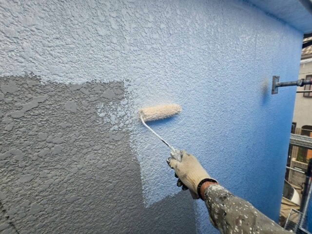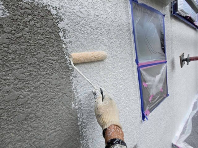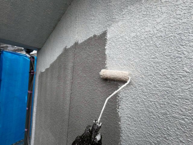 ↑外壁 1回目下塗り(シーラー)塗布作業中