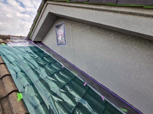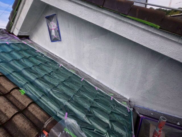 ↑屋根 漆喰箇所 シーラー塗布作業中 漆喰のくっつきを良くするための接着剤のような役割の塗料の塗布作業になります💁♂️︎🤍こちらは 塗布する業者と塗布しない業者がいます😊
