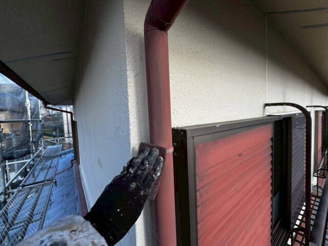 ↑軒どい 錆止め(鉄部下塗り)塗布作業中