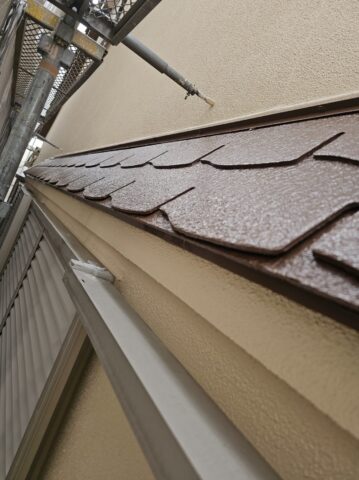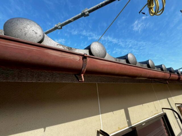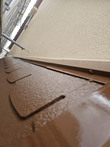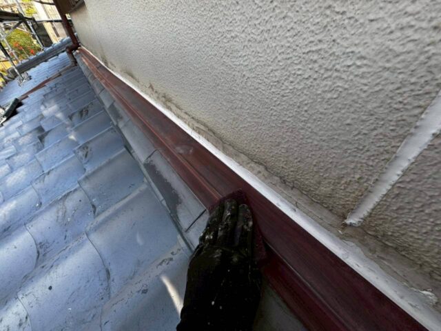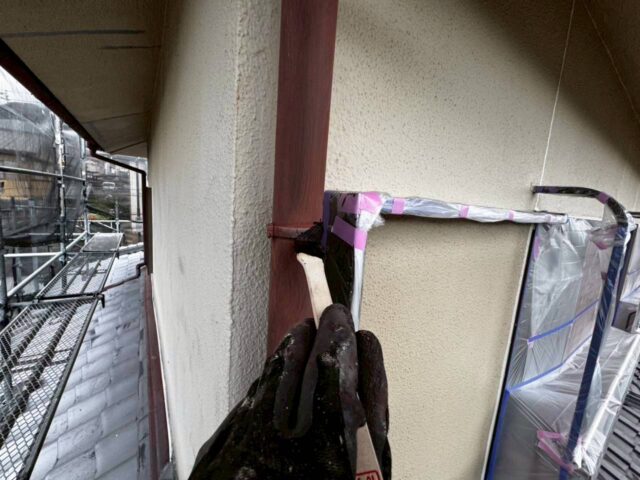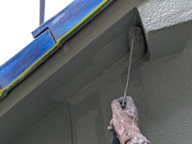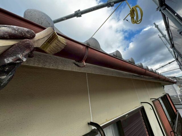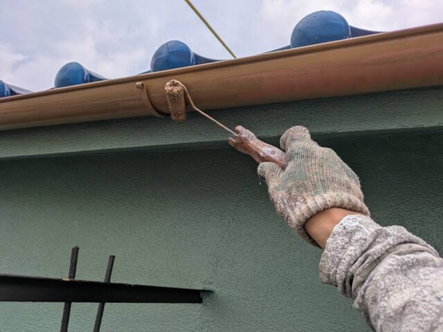 ↑軒どい 2回目上塗り(トップコート)塗布作業中