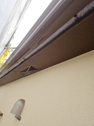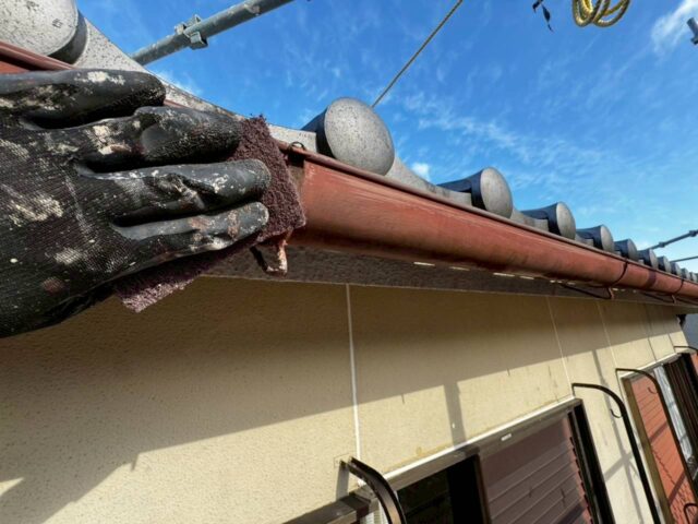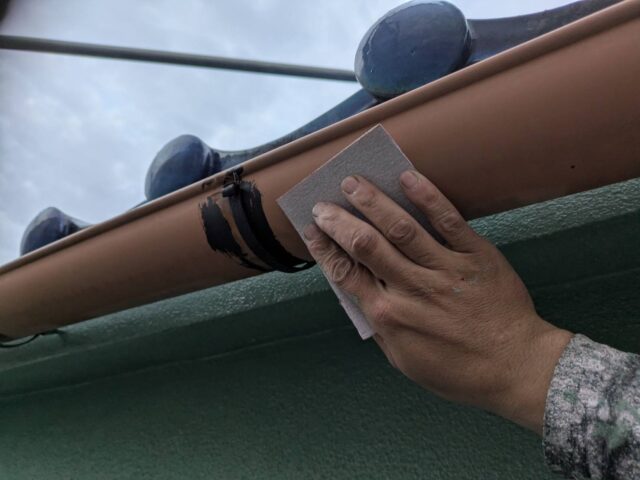↑軒どい 目粗し作業中 目粗しとは?表面に細かい傷をつけることで塗料の密着をよくする大切な作業になります🥺高圧洗浄で落としきれなかったこびりついた汚れやサビなどを取り除く作業でもあります😆🤍