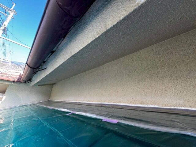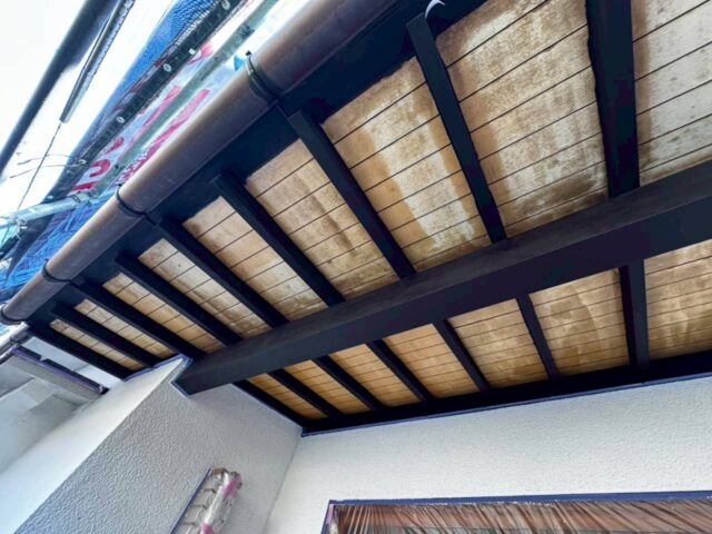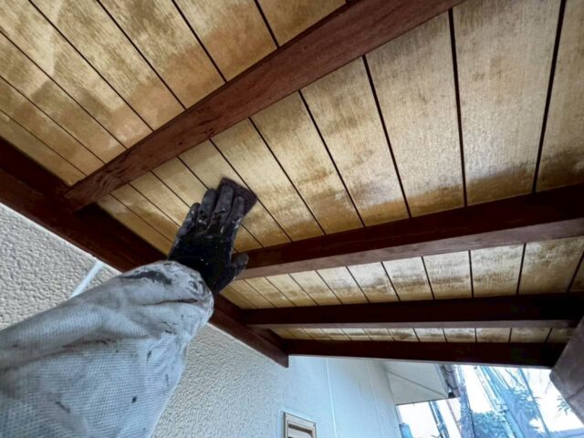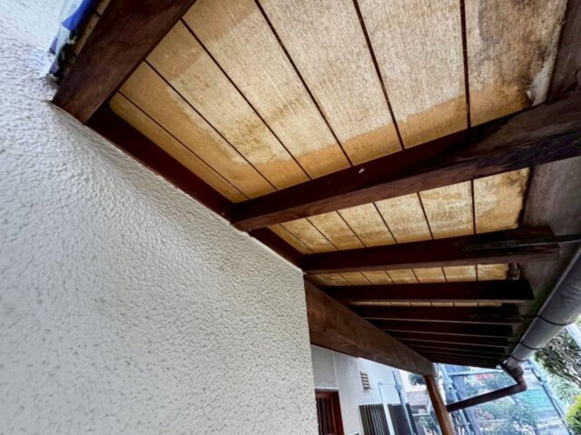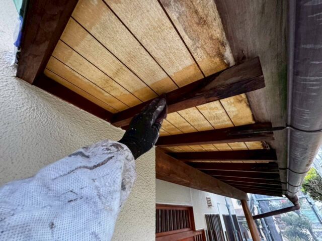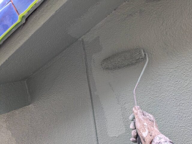 ↑軒天 下塗り(フィラー)塗布作業中 下地調整(下地を整える)をするのに効果的な下塗り材になります😆❤
