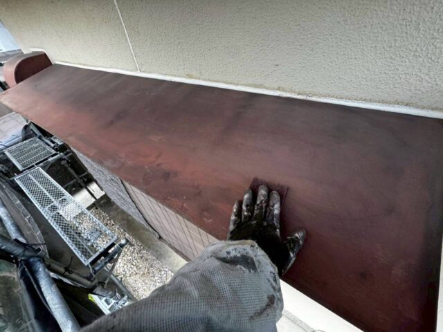 ↑雨押さえ板金 錆止め(鉄部下塗り)塗布作業中