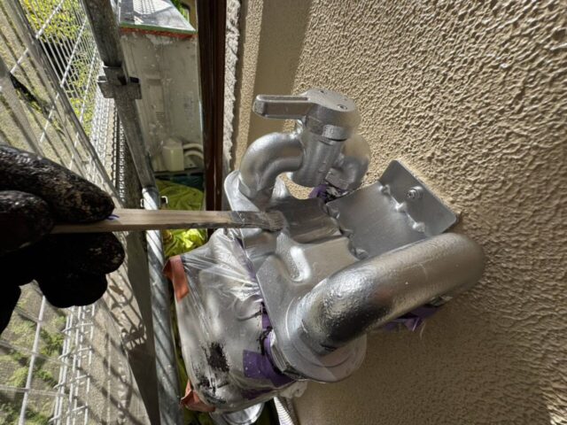 ↑ガス管 2回目上塗り(トップコート)アルミニウムペイント塗布作業中