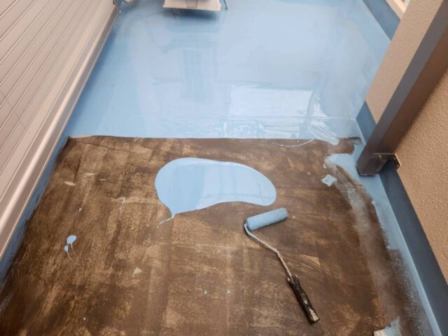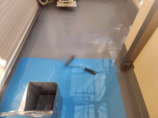↑バルコニー土間(床) トップコート塗布作業中 トップコートとは?紫外線や雨などから防水層を守るための仕上げ材になります🤗