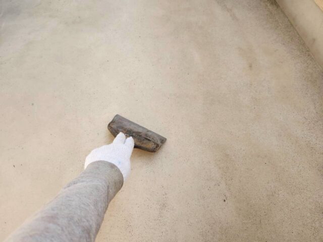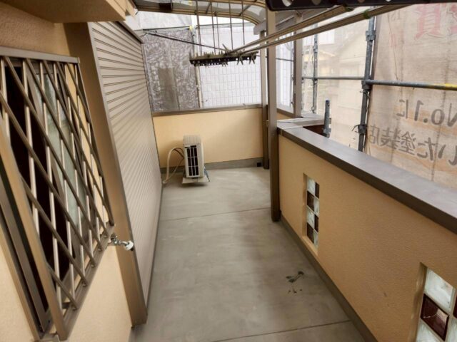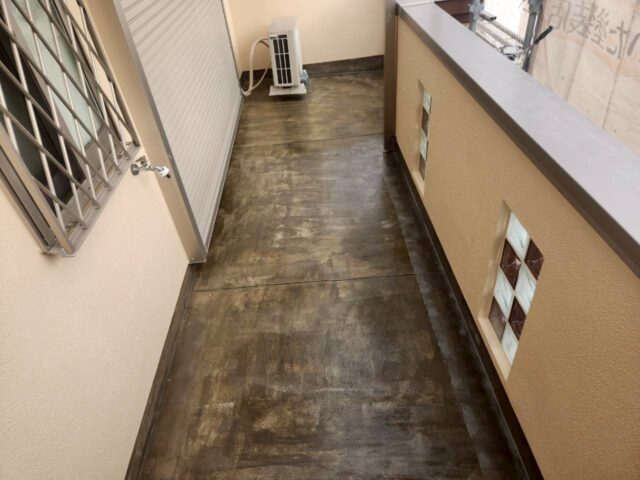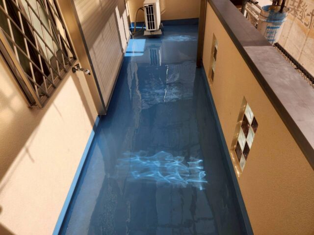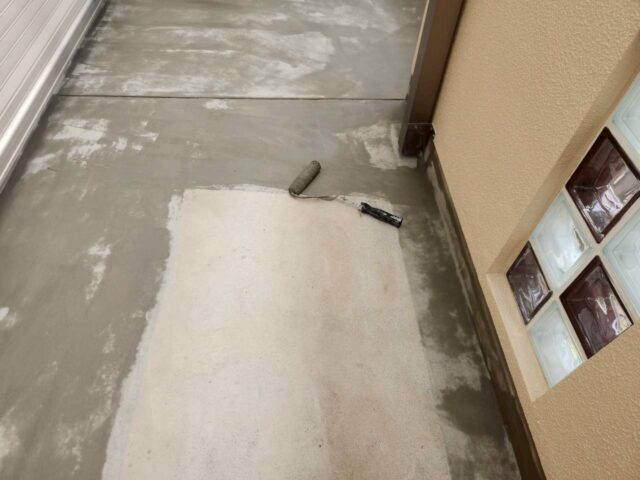 ↑バルコニー土間(床) 下地調整材塗布作業中 下地を整えるための塗料になります💁