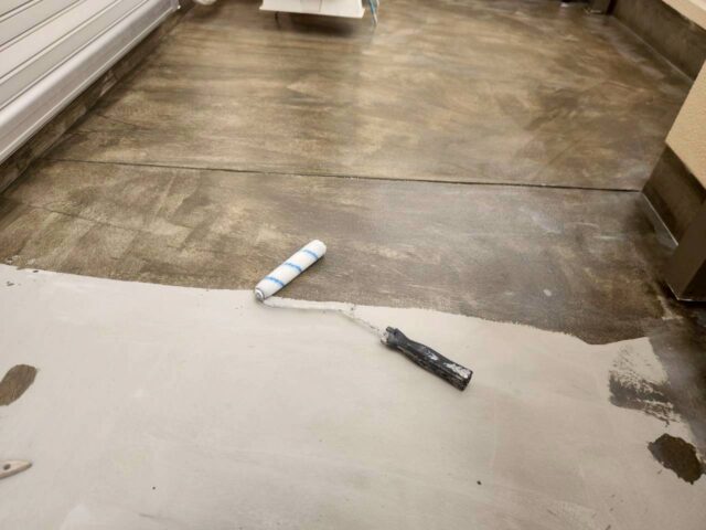 ↑バルコニー土間(床) プライマー塗布作業中 プライマーとは?防水材の密着を良くするための接着剤のような役割の塗料になります🤩