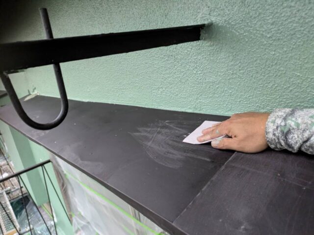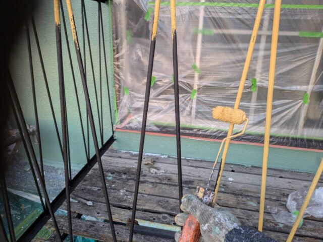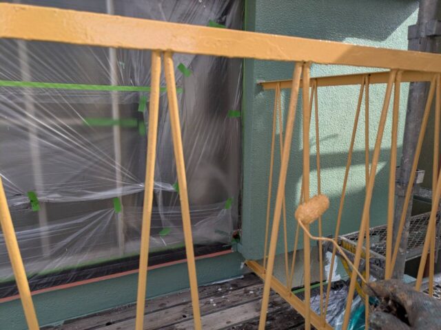 ↑鉄部手すり 1回目上塗り(トップコート)塗布作業中