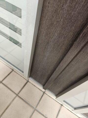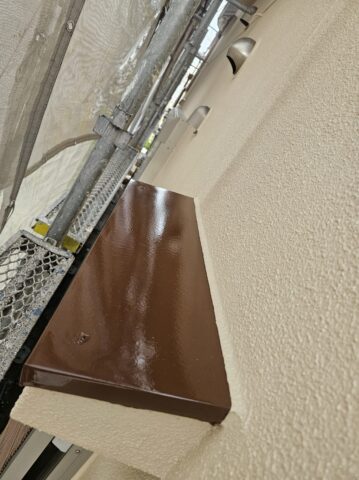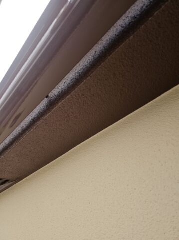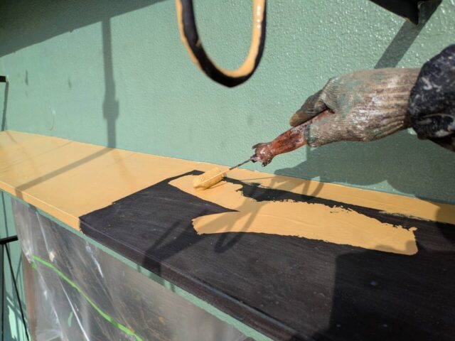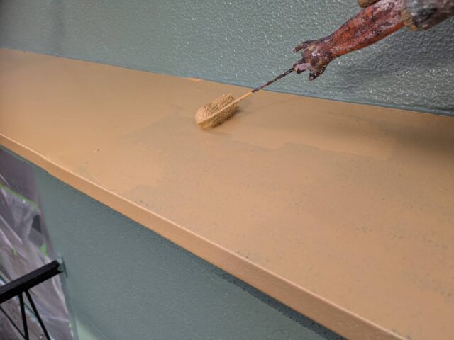 ↑ひさし 1回目上塗り(トップコート)塗布作業中 外壁部分と付帯部分の塗料(材料)が同じと思われがちなのですが ペンターテイナーでは 外壁は水性塗料・付帯箇所は溶剤(油性)塗料を使用する事が多いです♥️ペンターテイナーでは こういった付帯箇所へ使用する塗料のグレードにもこだわっております✌️❤