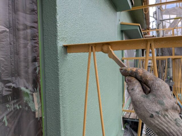 ↑鉄部手すり 2回目上塗り(トップコート)塗布作業中
