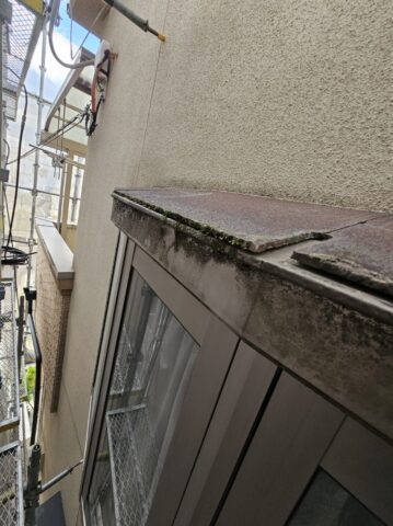 ↑ひさし 錆止め(鉄部下塗り)塗布作業中