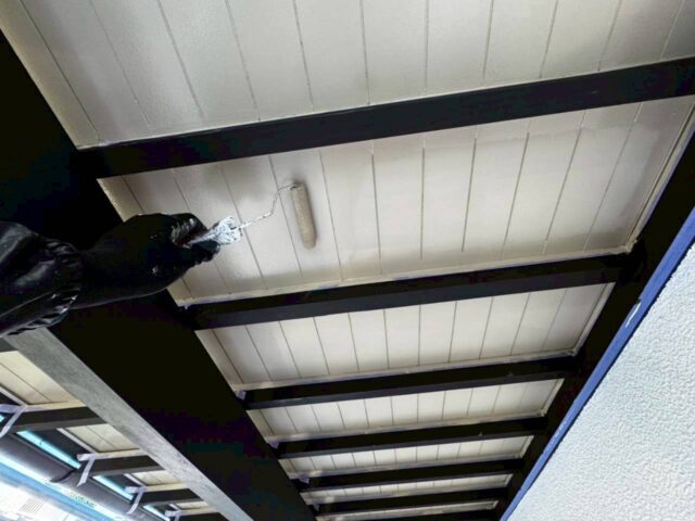 ↑ピーリング天井 1回目上塗り(トップコート)塗布作業中