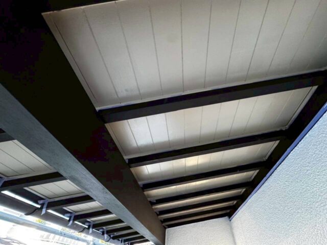 ↑軒天 下塗り(フィラー)塗布作業中 下地調整(下地を整える)をするのに効果的な下塗り材になります😆❤