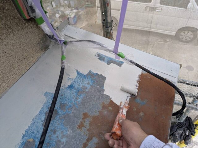 ↑雨押え板金 1回目上塗り(トップコート)塗布作業中