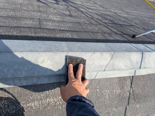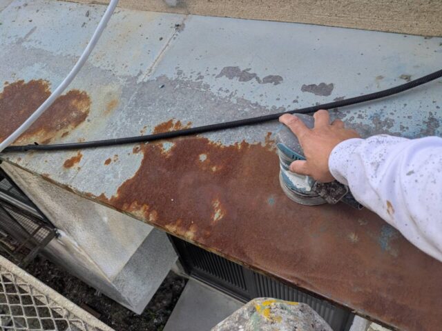 ↑雨押え板金 錆止め(鉄部下塗り)後のケレン作業中 表面を平滑に仕上げるためのひと手間になります︎🤍