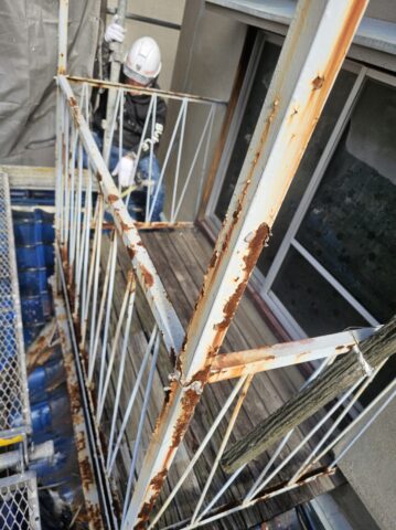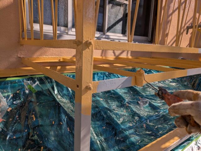 ↑バルコニー鉄部手すり 錆止め(鉄部下塗り)後の1回目上塗り(トップコート)塗布作業中