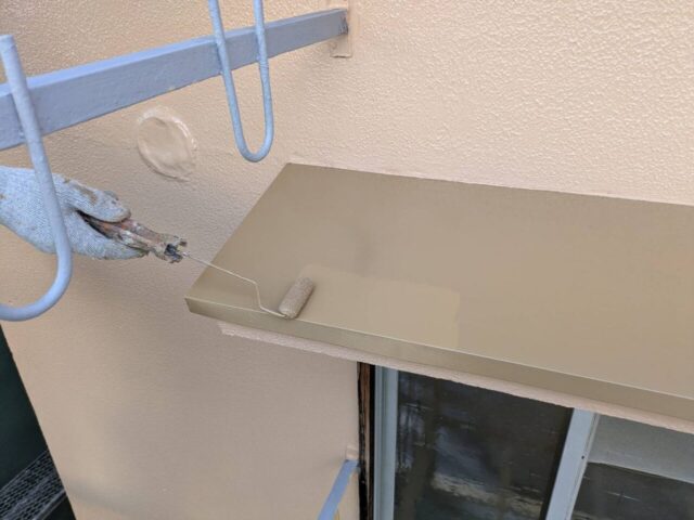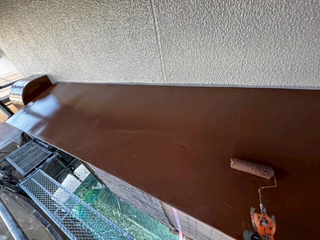 ↑ひさし 錆止め(鉄部下塗り)後の 1回目上塗り(トップコート)塗布作業中