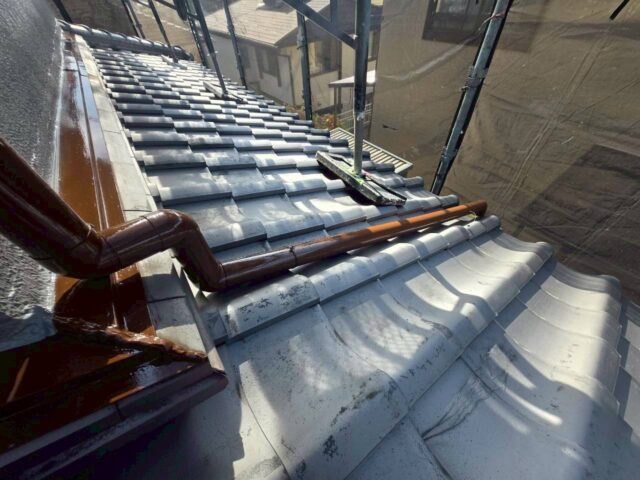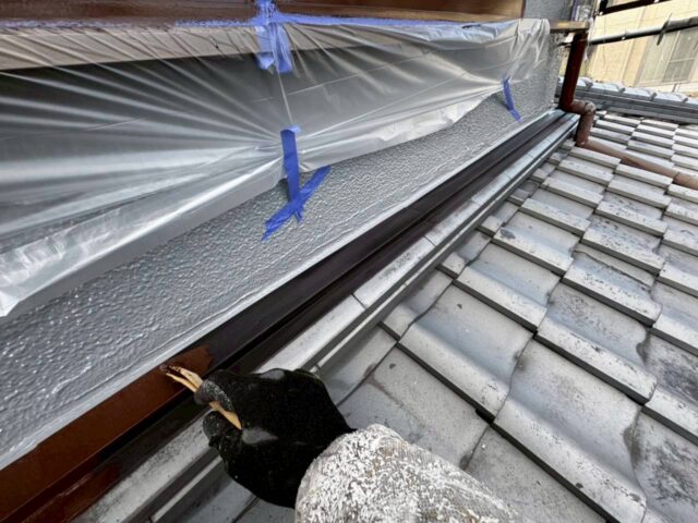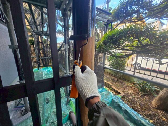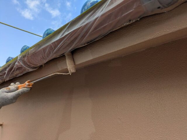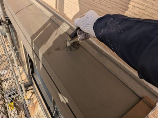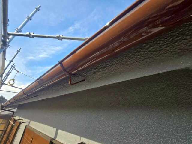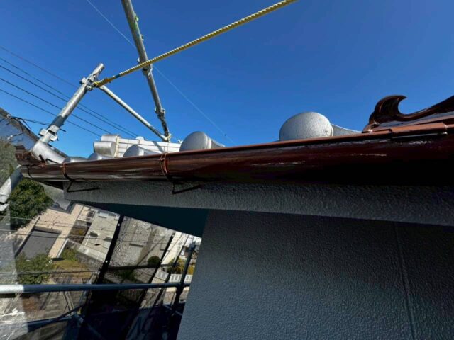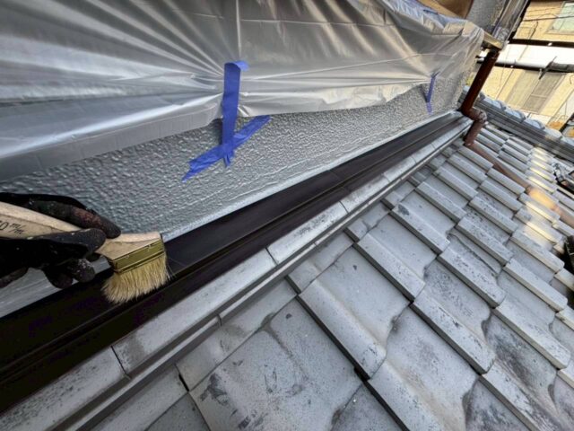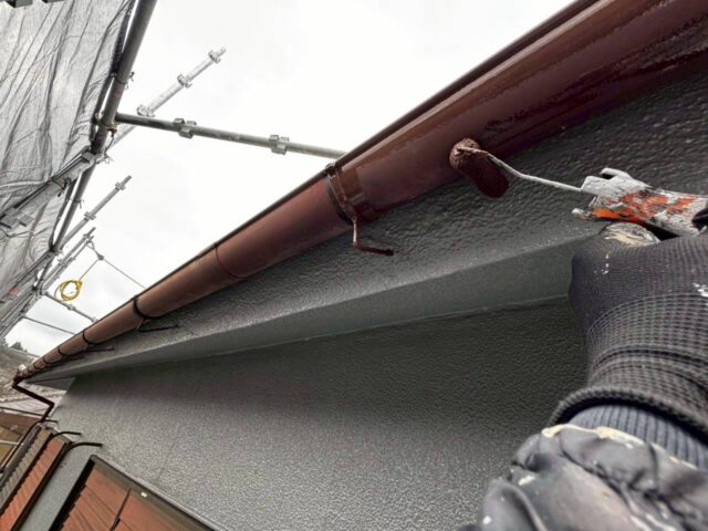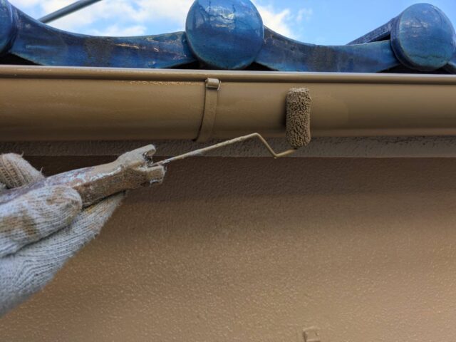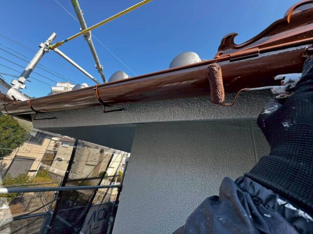 ↑軒どい 2回目上塗り(トップコート)塗布作業中