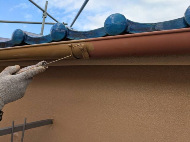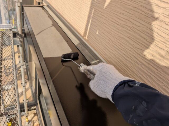 ↑軒どい 1回目上塗り(トップコート)塗布作業中