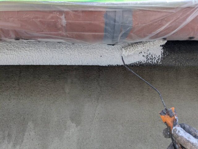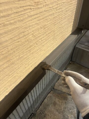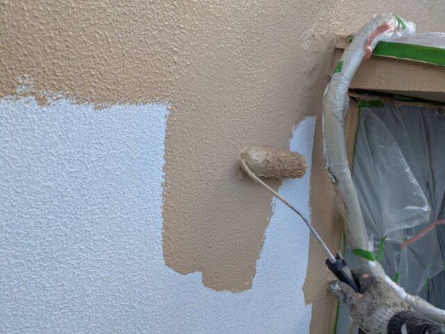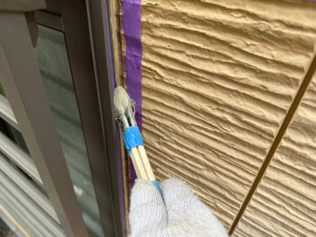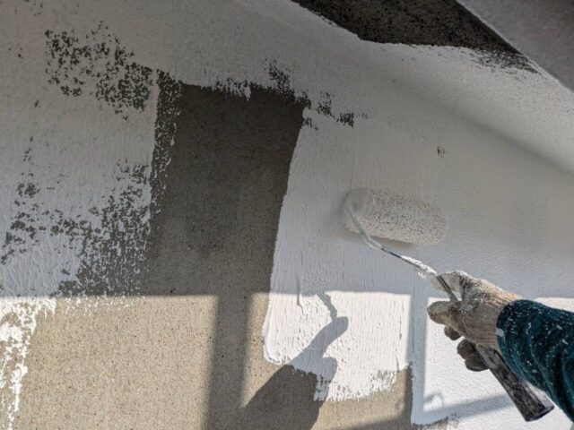 ↑削った後は コーキング補修を外壁 1回目下塗り(シーラー)塗布作業中