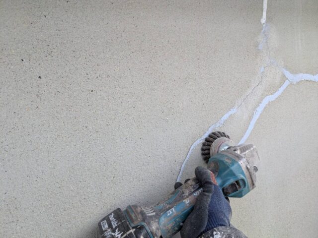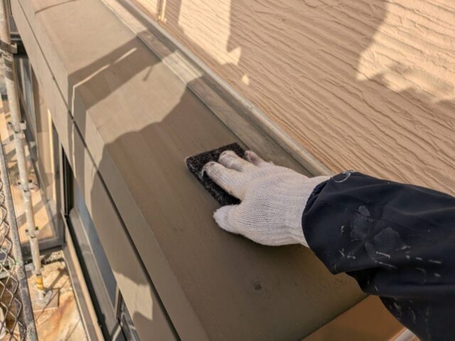 ↑土台水切り 目粗し作業中 目粗しとは?表面に細かい傷をつけることで塗料の密着をよくする大切な作業になります🥺高圧洗浄で落としきれなかったこびりついた汚れやサビなどを取り除く作業でもあります😆🤍