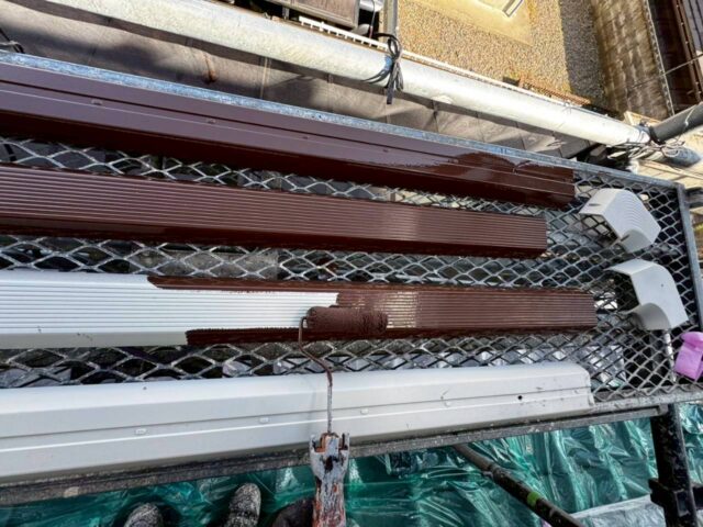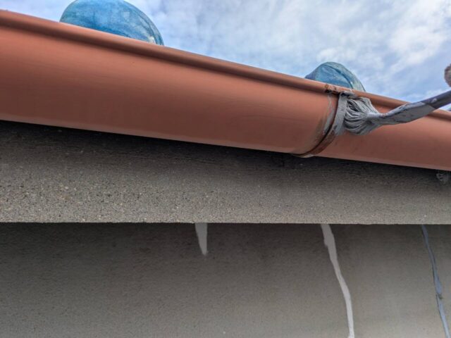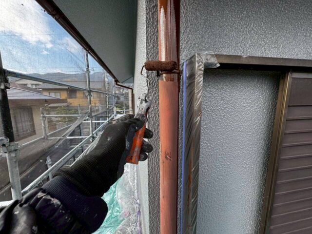 ↑雨どい 1回目上塗り(トップコート)塗布作業中