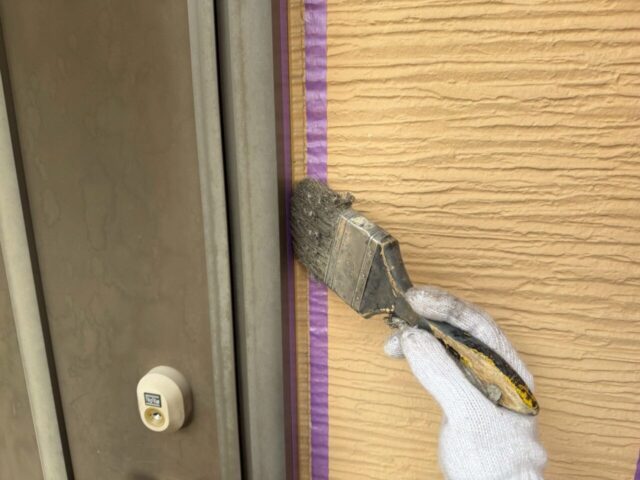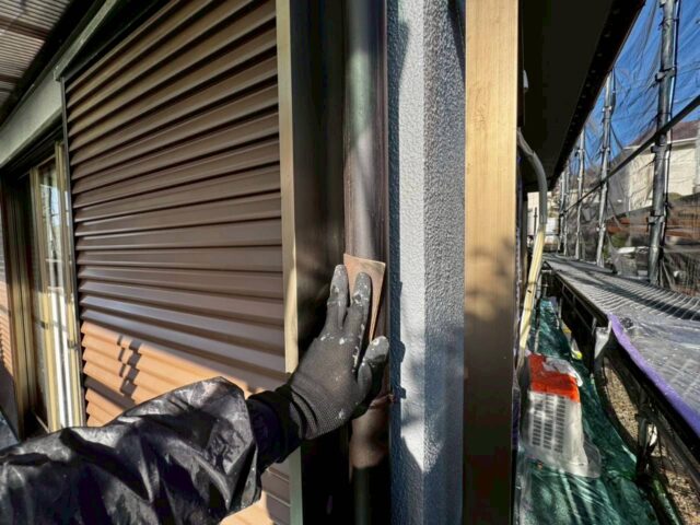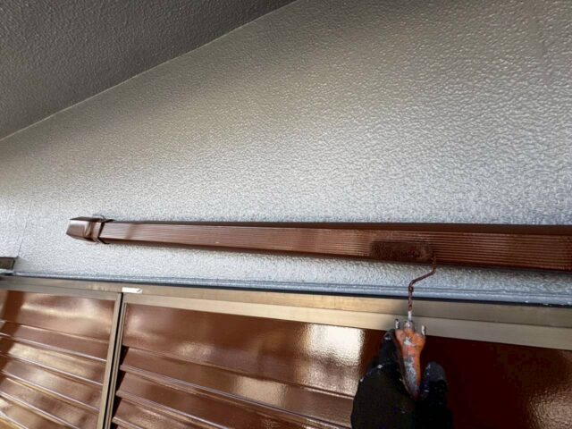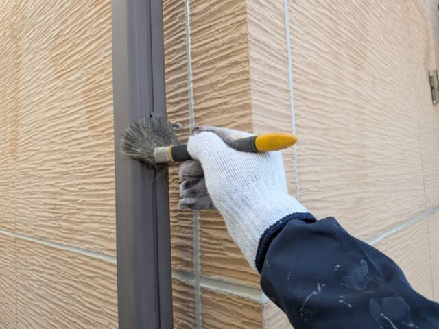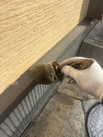 ↑外壁 チリ取り作業中 チリ取り作業とは?細かくてローラーでは塗装できない箇所を刷毛などで塗装する作業になります🫡🫡