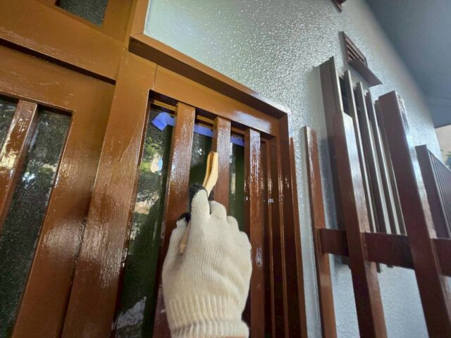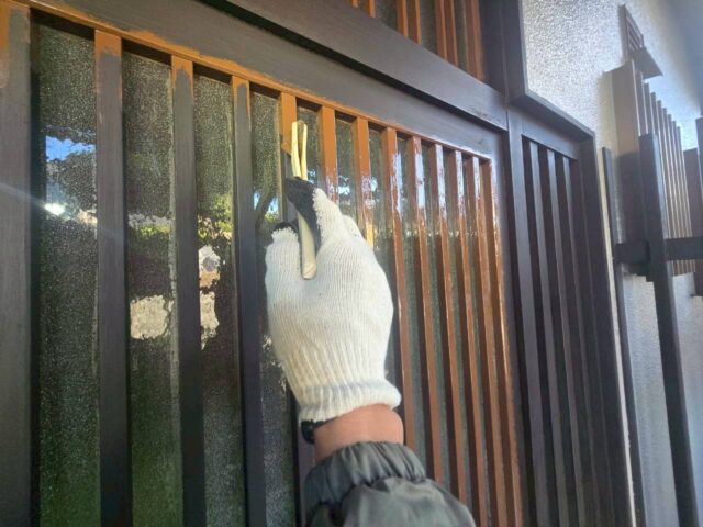 ↑玄関扉 木部格子 2回目上塗り(トップコート)塗布作業中