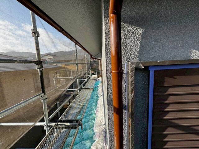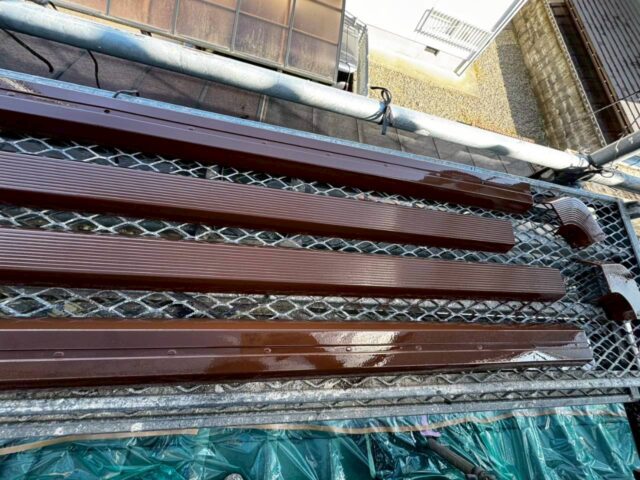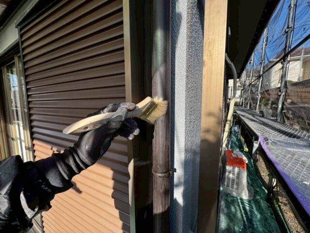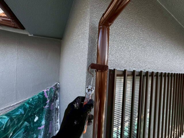 ↑雨どい 2回目上塗り(トップコート)塗布作業中