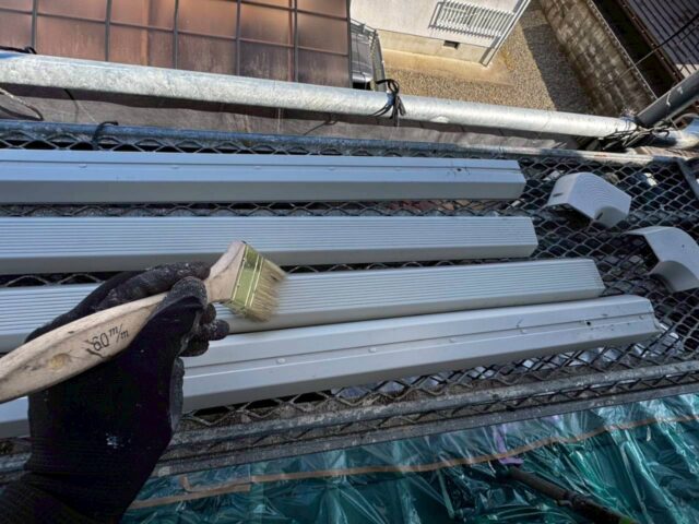 ↑軒どい留め具金物 錆止め(鉄部下塗り)塗布作業中