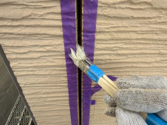 ↑外壁目地 プライマー塗布作業中 プライマーとは?シーリング材の密着を良くするための接着剤のような役割の塗料になります💁︎🤍
