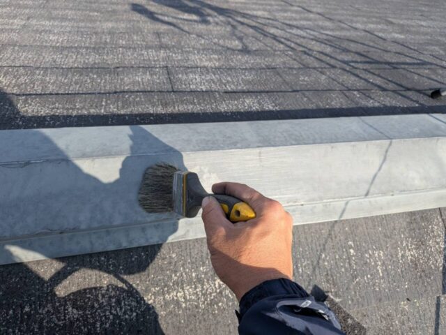 ↑屋根 板金箇所 錆止め(鉄部下塗り)塗布作業中