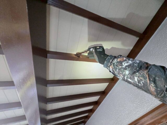 ↑軒天井(上げ裏) 垂木と天井の色分け 1回目上塗り塗布作業中