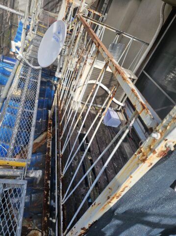 ↑バルコニー鉄部手すり 2回目上塗り(トップコート)塗布作業中