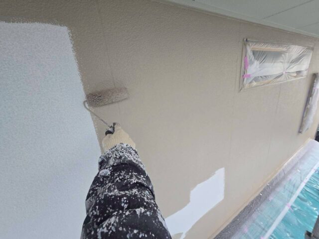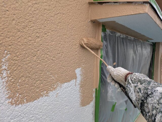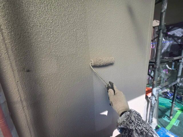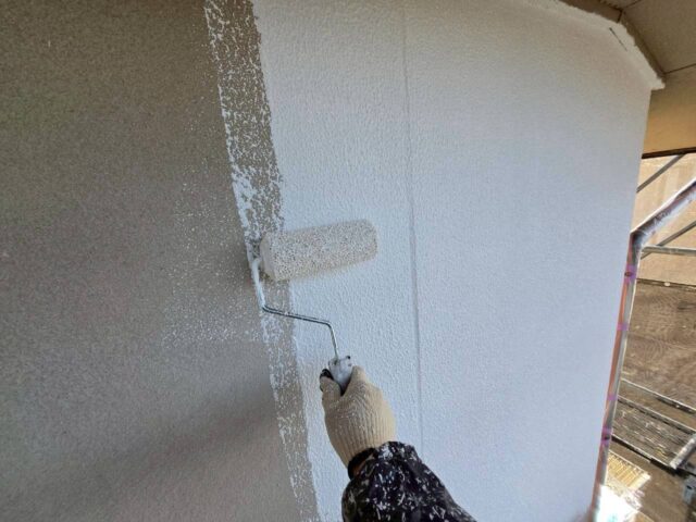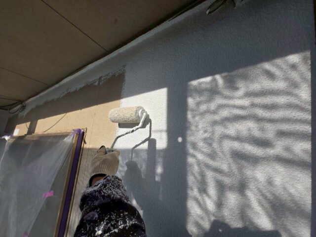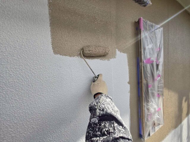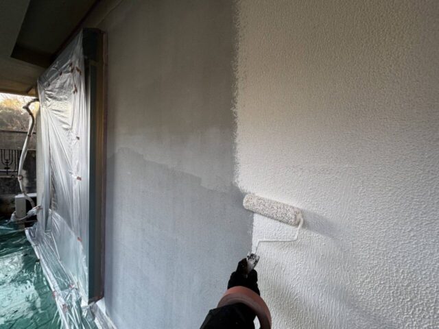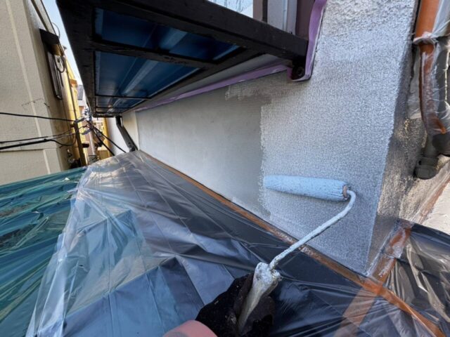 ↑外壁 2回目下塗り(マスチック工法)塗布作業中