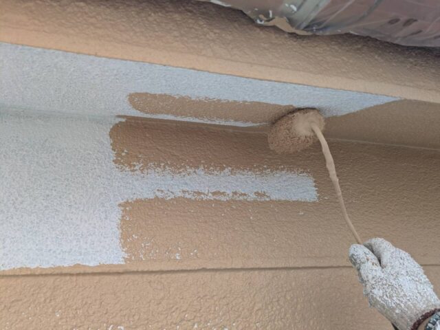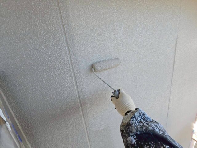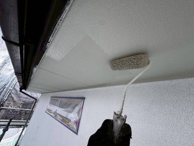 ↑軒天井 2日目上塗り(トップコート)塗布作業中