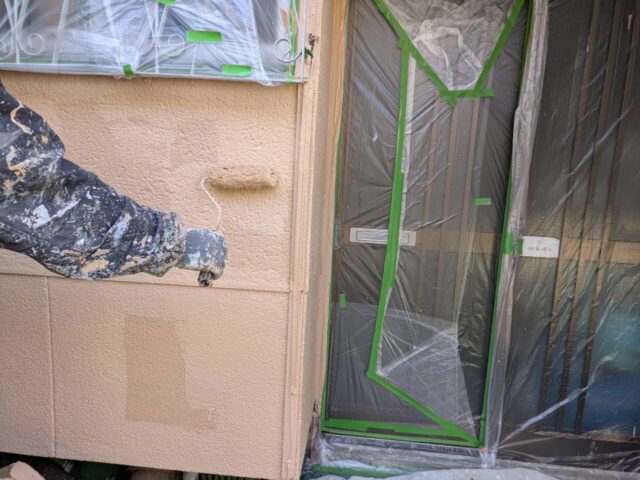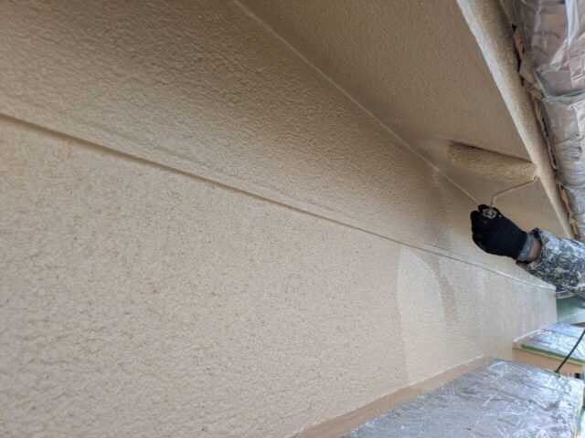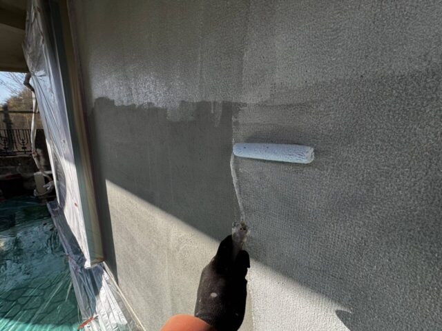 ↑外壁 1回目下塗り(シーラー)塗布作業中
