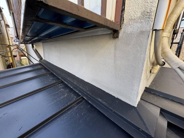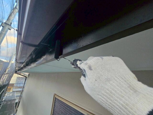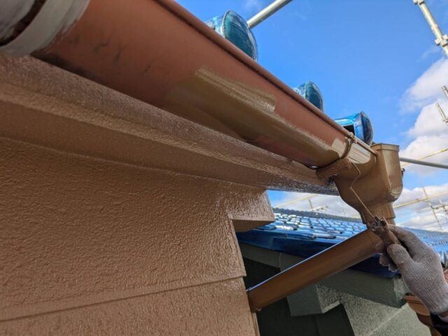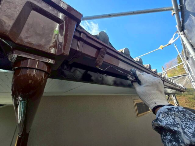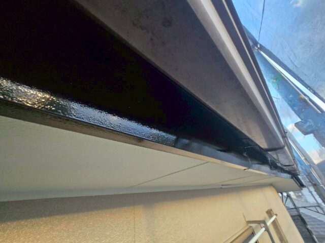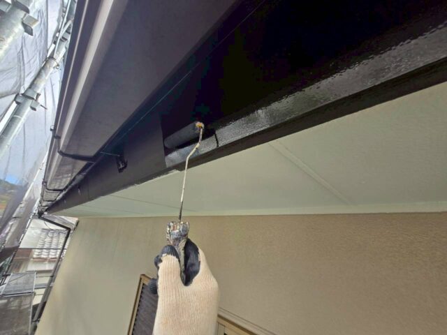 ↑軒どい 2回目上塗り(トップコート)塗布作業中