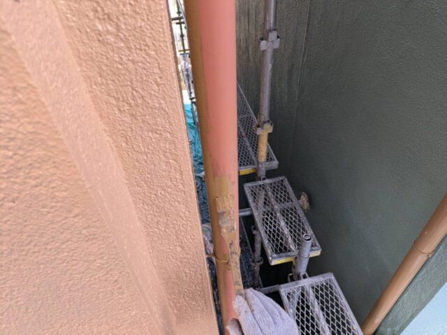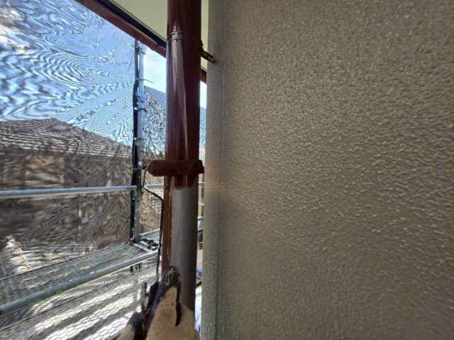↑雨どい 目粗し後の1回目上塗り(トップコート)塗布作業中