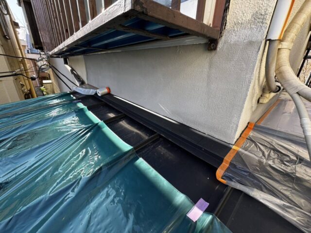 ↑軒どい 目粗し後の1回目上塗り(トップコート)塗布作業中
