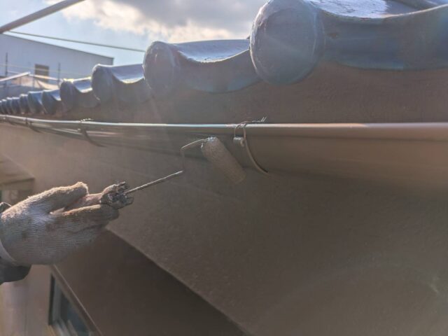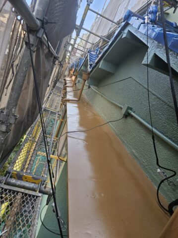 ↑軒どい 2回目上塗り(トップコート)塗布作業中