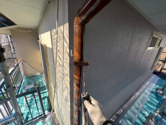 ↑雨どい 2回目上塗り(トップコート)塗布作業中