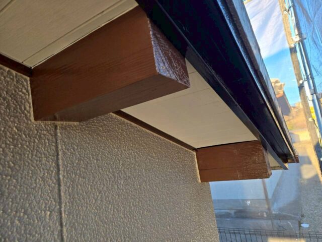 ↑軒どい 2日目上塗り(トップコート)塗布作業中 外壁部分と付帯部分の塗料(材料)が同じと思われがちなのですが ペンターテイナーでは 外壁は水性塗料・付帯箇所は溶剤(油性)塗料を使用する事が多いです♥️ペンターテイナーでは こういった付帯箇所へ使用する塗料のグレードにもこだわっております✌️❤