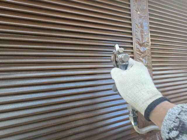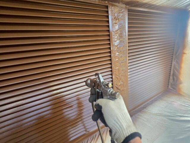 ↑雨戸 2回目上塗り(トップコート)吹き付け作業中
