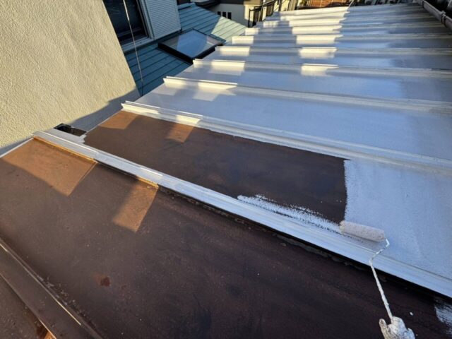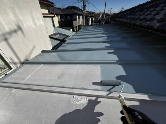 ↑金属屋根 中塗り(トップコート)塗布作業中