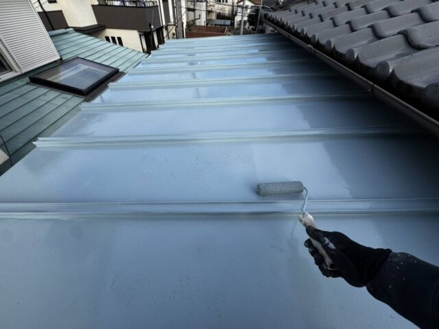 ↑金属屋根 上塗り(トップコート)塗布作業中