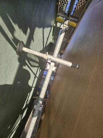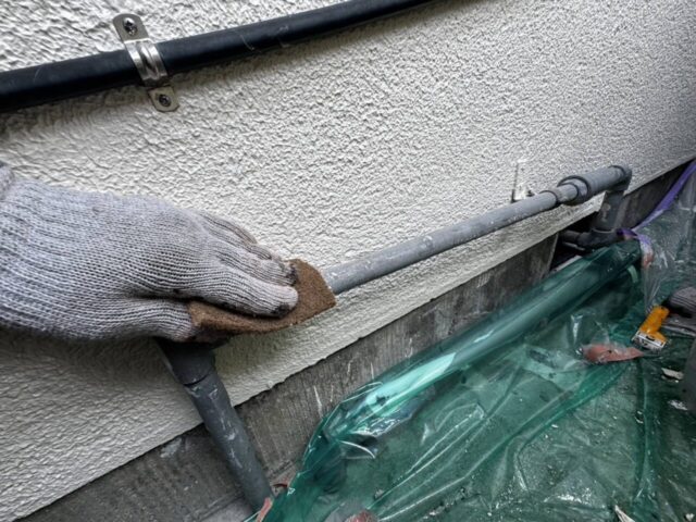 ↑配管 目粗し作業中 目粗しとは?表面に細かい傷をつけることで塗料の密着をよくする大切な作業になります🥺高圧洗浄で落としきれなかったこびりついた汚れやサビなどを取り除く作業でもあります😆🤍
