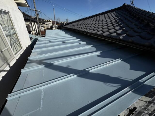 ↑金属屋根 中塗り(トップコート)塗布完了